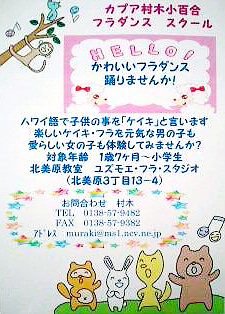 3/25(金)16:00よりケイキ・フラの体験レッスンをします。会場はユズモエ・フラ・スタジオ(北美原3丁目13-4)です。お問い合わせお待ちしています。(0138-57-9482 村木)