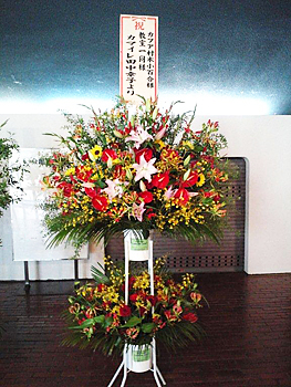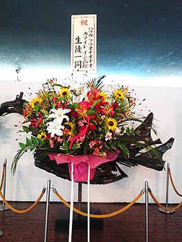 この写真はカマイレ田中幸子先生とカモミ田中祐子先生とカプア村木小百合教室の生徒全員からのお花の前で撮った一枚です。この日踊ることはできなくても、楽屋で最後までお手伝いして下さった大切な仲間と撮った大切な記念の写真です。